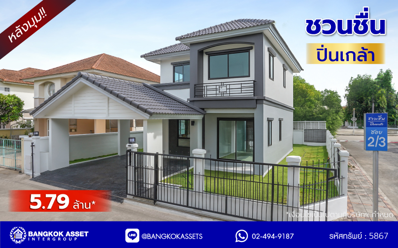 ขาย - บ้านเดี่ยวมือสองนนทบุรี โครงการ รัชชา5 กาญจนาภิเษก เนื้อที่ 72.50 ตร.ว. พื้นที่ใช้สอย 180 ตร.ม. ฟังก์ชัน 3 ห้องนอน 3 ห้องน้ำ 2 ที่จอดรถ บ้านสภาพสวย พร้อมเข้าอยู่ บนทำเลแห่งการเดินทาง เชื่อมต่อถนนกาญจนาภิเษก, ถนนรัตนาธิเบศร์, ถนนราชพฤกษ์ ใกล้รถไฟฟ้าสายสีม่วง "สถานีตลาดบางใหญ่"